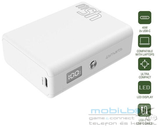 4smarts Pocket Slim külső akkumulátor, 10000mAh, 45W, fehér Powerbank 10000mAh: Az Ön mobil akkumulátora minden eszközéhez Fedezze fel a 10 000 mAh-s akkumulátort gyorstöltéssel. Ez az Ön megbízható társa, aki nem csak okostelefonokat, táblagépeket és okosórákat, hanem laptopokat is működtet. Még ha nem is tudja teljesen feltölteni a laptopját, elegendő energiát biztosí