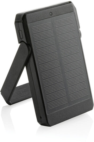 5000 mAh napelemes powerbank RCS újrahasznosított ABS-ből. Teljes újrahasznosított anyag tartalom: 21% a termék összsúlya alapján. Az RCS-tanúsítvány biztosítja az újrahasznosított anyagok ellátási láncát. A powerbank 19%-os konverziós aránnyal használ kiváló minőségű monokristályos napelemeket. A töltési arány a feltételektől függ. Beépített állvány funkcióv
