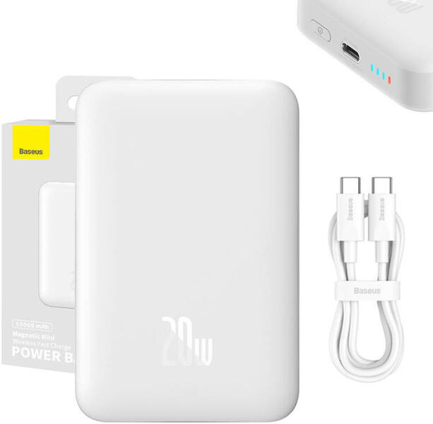 Baseus Mágneses Mini Powerbank, USB-C, 10000mAh, 20W, MagSafe (fehér) Baseus Mágneses Mini Powerbank, USB-C, 10000mAh, 20W, MagSafe (fehér) Töltse gyorsan és biztonságosan eszközeit a Baseus powerbankkal! A Baseus Magnetic Mini powerbank USB-C porttal rendelkezik, vezeték nélküli töltést is lehetővé tesz. Kapacitása eléri a 10 000 mAh-t. Beépített kijelzővel rendelkezik, amely