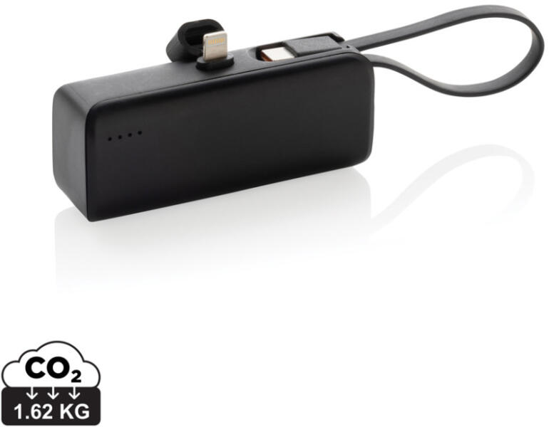 Hordozható és zsebméretű powerbank. Lightning csatlakozóval ami egyszerűen csatlakoztatható az iPhone-hoz. A 3000 mAh-s powerbank integrált USB-C bemeneti és kimeneti kábellel is rendelkezik, ami USB-C eszközök töltésére és a powerbank újratöltésére is használható. Használatához vagy újratöltéséhez nincs szükség kábelekre. Újrahasznosított ABS-ből és újrahasznos