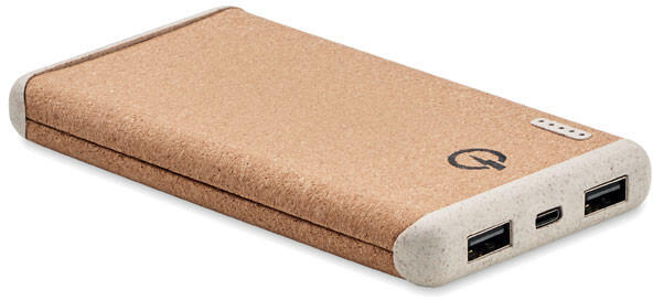 10.000 mAh külső akkumulátor, 10 W-os vezeték nélküli töltéssel, parafa házzal, ABS-búzaszalma részletekkel. Támogatja a gyorstöltési technológiát (20 W). C típusú bemenet és kimenet. A parafa 100%-ban természetes anyag. Szerkezeti jellege és felületi porozitása miatt az egyes tárgyak végső emblémázási eredménye eltéréseket mutathat. PD (Power Delivery) támogatáss