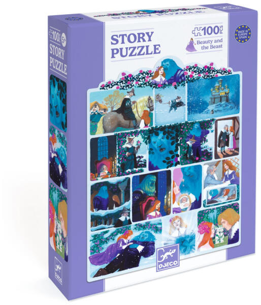 Mit kell tudni a játékról? Story puzzle - A szépség és a szörnyeteg 100 db-os Különleges Djeco puzzle, mellyel a gyerekek egy képregény élményéhez juthatnak. A 100 db-os kirakóval a gyerekek "A szépség és a szörnyeteg" meséjébe nyerhetnek betekintést külön képkockák segítségével. Mintha egy diafilmet vetítenének, csak ehhez nekik kell kirakni a különböző történ