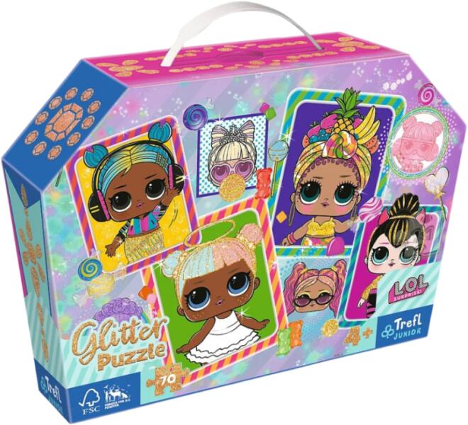 A Trefl Junior LOL babák-glitter puzzle egy 70 darabból álló színes kirakós játék, melynek egyes elemei finom aranycsillámmal vannak ellátva, így ragyogva kelnek életre. Azok számára ideális, akik odavannak a rejtvényekért és a LOL meglepetés babákért. A puzzle egy praktikus, fogantyús tokban érkezik, amely lehetővé teszi az egyszerű szállítást. Egy igazi kombinációj