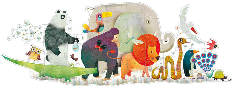 Vidám fesztivál a padlón, óriás puzzle óriási, parádés alakokkal! Felvonul egy egész állatseregletet a szoba padlóján. Masíroznak a parádéra kiöltözött állatok egymás után. Igen különbözőek, mégis együtt ünnepelnek, ki-ki a maga módján, az egészen kicsi hangyától a hatalmas elefántig, mindenki örül!Krokodil, teknős, panda, oroszlán. kígyó, gorilla, csiga é