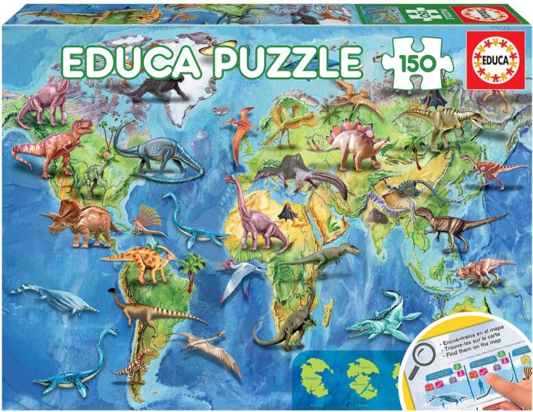 Gyermek puzzle Dinosaurus World Map motivummal a spanyol Educa vállalat műhelyéből örömet szerez fiúknak és lányoknak egyaránt már 7 éves kortól. A képkirakón világtérkép jelenik meg dinoszauruszokkal az egyes kontinenseken. Ez a nagyszerű puzzle minden gyerkőc figyelmét leköti, akik élnek-halnak a dinókért. Az összeillesztett oktató puzzle újra darabjaira bontható és