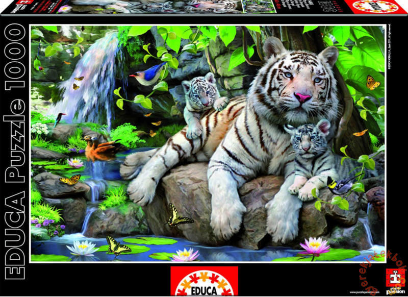 Puzzle gyerekeknek és felnőtteknek White Tigers of Bengal motívumban . A képkirakón fehér bengáli tigris látható kölykeivel, melyek egy sziklán pihennek egy erdei vízesés mellett. A csomag 1000 drb elemet tartalmaz. Puzzle nagyobbaknak összeillesztés után egy képet jelenít meg. A puzzle elemei minőségi alapanyagból készültek. Megfelel a biztonsági szabványoknak - biztonsá