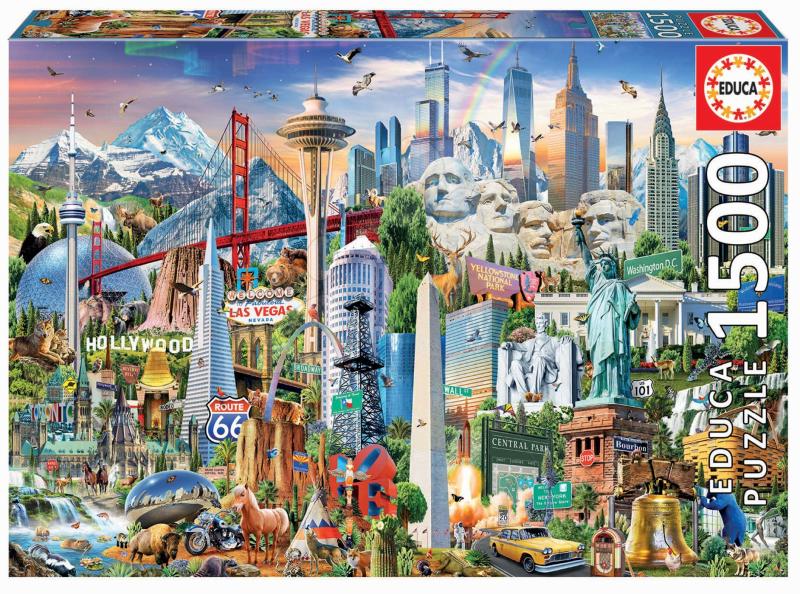 Symbols from North America puzzle örömet szerez kicsiknek és nagyoknak egyaránt. A képkirakón Észak-Amerika nevezetes szimbólumai láthatóak . Puzzle csomag 1500 darabos . Puzzle minőségi alapanyagból készült és összeillesztés után egy képet jelenít meg. A képkirakó minőségi alapanyagból készült. Az elemek megfelelnek a biztonsági szabványoknak - biztonságosak gyereke