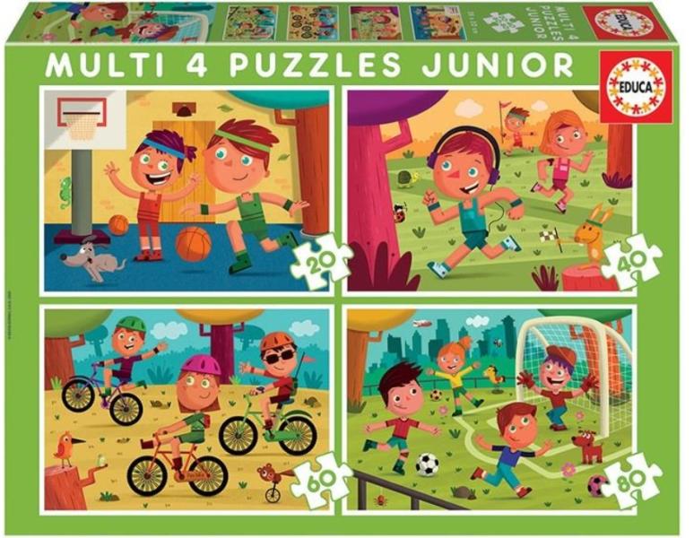 Multi 4 puzzle Sport motívu mmal igazán kiváló ajándék a spanyol Educa gyártó műhelyéből örökmozgó gyerekeknek 4 éves kortól . Képkirakó ábráján különböző sport jelenetek köszönnek vissza, mint a foci, kosárlabda, futás és bringázás. A csomagolás 4 képkirakót tartalmaz, melyek 20, 40, 60 és 80 darabból állnak. Az eltérő darabszámból álló puzzle együtt n