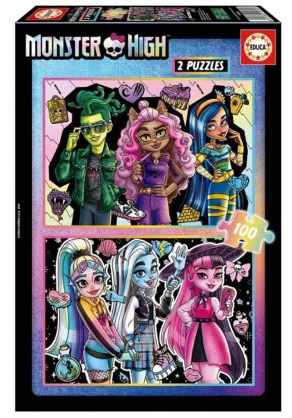 Puzzle gyerekeknek Monster High motívummal a spanyol Educa műhelyéből egy igazán eredeti ajándék minden csöppség részére már 6 éves kortól. Az összeillesztett elemek 2 képet adnak ki a divatos Monster High babák ábráival. A csomag 2x100 darabos. Puzzle minőségi alapanyagból készült, megfelel a biztonsági előírásoknak - biztonságos kicsik és nagyok részére egyaránt.
