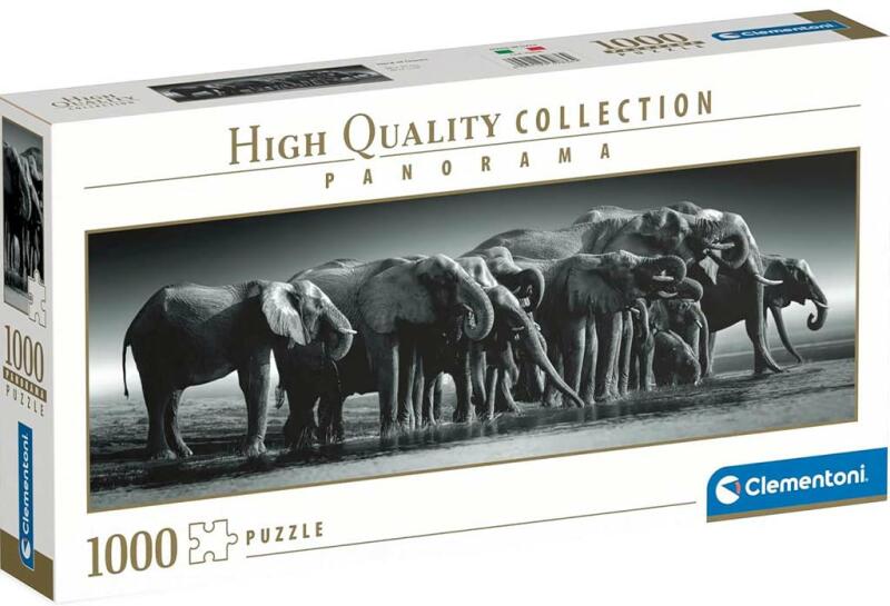 Ez a gyönyörű 1000 darabos panoráma puzzle a Clementoni High Quality Collection része, amely egy elefántcsordát ábrázol. A lenyűgöző fekete-fehér kompozíció nemcsak a kirakás örömét kínálja, hanem a természet és a vadon szépségét is megmutatja, amint ezek a hatalmas teremtmények összegyűlnek az afrikai tájban. A részletes kép lenyűgöző látványt nyújt, amikor a