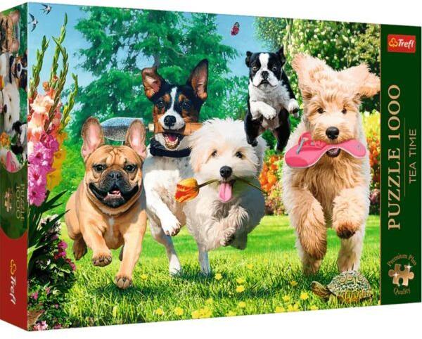 Kutyabrigád 1000db-os prémium puzzle - Trefl Hivatalos magyarországi forgalmazótól. Leírás: A Kutyabrigád 1000 darabos prémium puzzle tökéletes választás minden kutyarajongó és puzzle-rajongó számára. Ez a Trefl által készített kirakós egy vidám jelenetet ábrázol, ahol öt különböző fajtájú kutyus boldogan, játékosan szalad egy tavaszi réten, miközben a szájukba