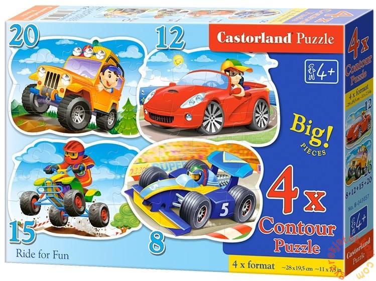 Ezen a puzzle-n 4 különböző járgánnyal ismerkedhetünk meg, melyekkel mind nagyszerű utazni, és végig száguldozni az úton. A kirakós 4 különböző darabszámú képből áll, melyek darabkái nagy méretűek, hogy a kicsik apró kezeikkel könnyedén megtudják fogni azokat anélkül, hogy gondot okozna neki. A puzzle kirakása közben rengeteget fejlődik a kézügyesség és a koor