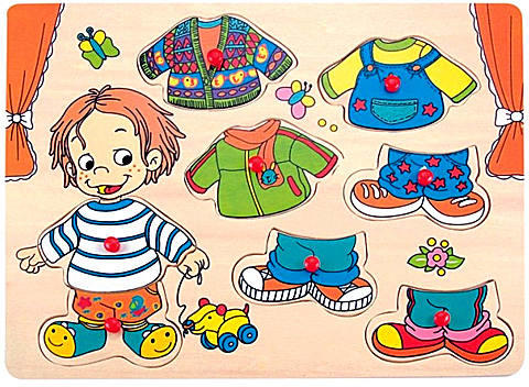 Fiús öltöztető fa formapuzzle Hivatalos magyarországi forgalmazótól. Leírás: A játékhoz is csinos ruhát szeretne magára ez a kisfiú, akinek a húzható kutyája sem maradhat ki a játékból. A gyerekeknek a fa formaillesztő puzzle elemeinek segítségével kell összeállítaniuk Sebastian ruházatát, így a mégy különböző felsőrész és a négy alsó rész kombinálásával