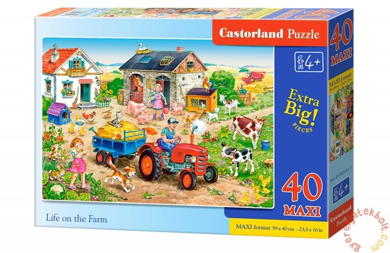 Extra nagy méretű elemekből álló képet állíthatnak össze a legkisebbek is, hiszen a nagy puzzle darabokat a kis kezek is könnyedén összeilleszthetik. A készségfejlesztő és rendkívül szórakoztató játék végeredményeként egy nagy, színes képet kaphatnak, melyen egy farm jelenete látható. A különböző állatok mellett a farmer és családja is látható a képen, valami