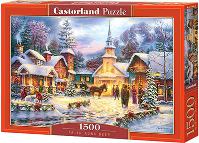 Egy békés kis faluba csöppenhetünk ezzel a puzzle-val. Épp Karácsony közeledik, és nagyban készülődnek az ünnepre, a gyermekek hőembert építenek, csodaszép díszekkel öltöztették fel a falut, az emberek pedig a templomba igyekeznek az ünnepi misére. A kép nyugalmat áraszt magából, és biztosan tetszeni fog majd. 1500 darabból áll a kép, mely kiváló minőségű, prémi