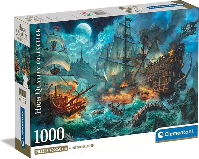 A Clementoni 39777 High Quality Collection Compact puzzle - Kalóz támadás 1000 db-os készlete mindazoknak kínál fantasztikus kikapcsolódást, akik odavannak az akciódús jelenetekért és csatákért. Hiszen a minőségi darabkákból kirakható képen egy elképesztő tengeri összecsapás jelenik meg, amelyben az ágyúké és a kalózhajóké a főszerep. Ha igazán izgalmas élmény re