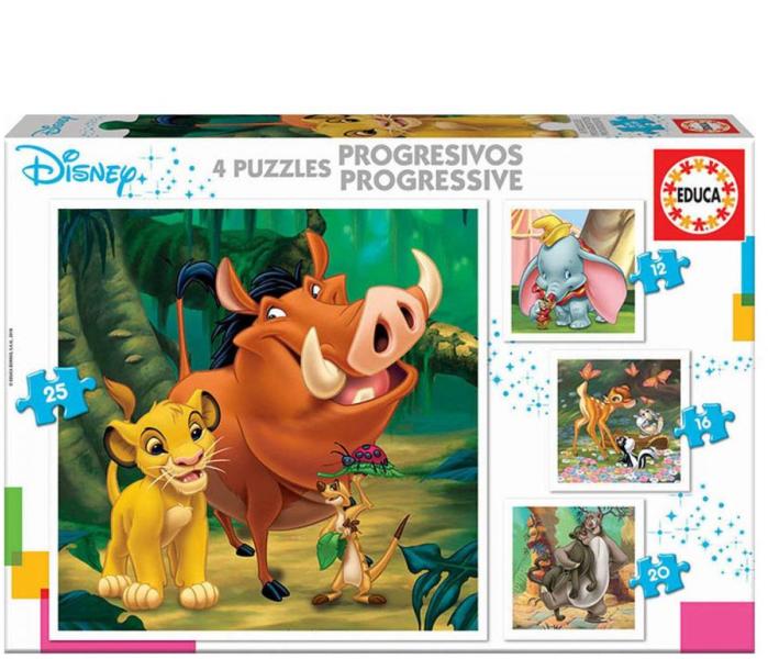 Gyermek puzzle Disney Oroszlánkirály mesemotívumm al örömet szerez minden kisfiúnak és kislánynak 3 éves kortól. Ezek a nem mindennapi progresszív puzzlek fejlesztően hatnak a gyerekek képességeire. Oroszlánkirály puzzle csomagban 4 fajta puzzle található, miközben mindegyikhez más-más mennyiségű puzzle darab tartozik. Képkirakózás a legegyszerűbb, 12 darabos képkirakó
