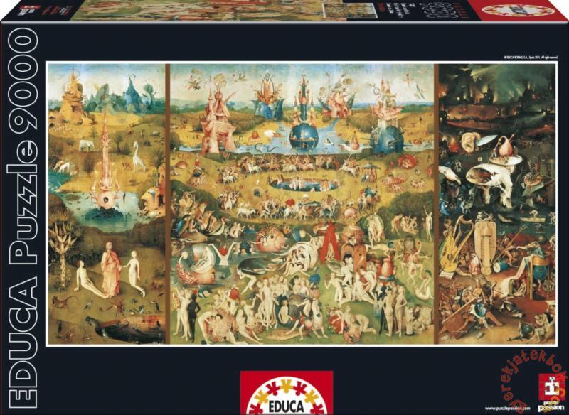 Puzzle gyerekeknek és felnőtteknek The Garden Of Earthly Delights motívumban a középkori festő, Hieronymus Boscha -tól . A képkirakón Földi örömök kertje látható. A képen különböző földi öröm látható, melyeknek az emberek nemtudnak ellenállni. A csomag 9000 drb elemet tartalmaz. Puzzle nagyobbaknak összeillesztés után egy képet jelenít meg. A puzzle elemei minőségi
