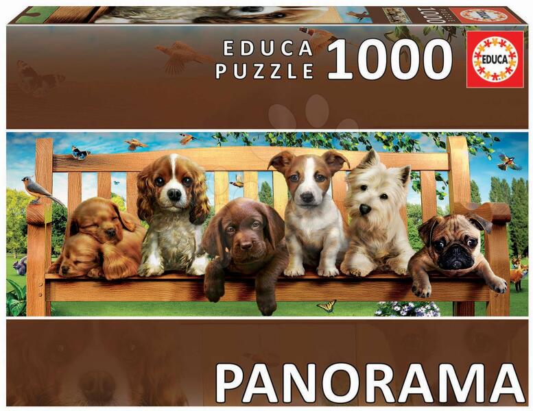 Puzzle gyermekek vagy felnőttek részére cuki Puppies on a bench motívummal a spanyol Educa vállalat műhelyéből nagy örömet szerez a képkirakók szerelmeseinek ez a cuki panoráma képkirakó padon ülő kutyusok ábrájával. A csomagolás 1000 db puzzle elemet tartalmaz. A puzzle gyermekek vagy felnőttek részére darabjainak megfelelő helyre illesztése egységes képet alkot. A puz