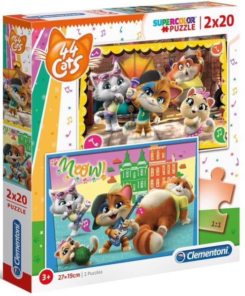 44 Csacska Macska Supercolor 2 az 1-ben puzzle 2x20db-os - Clementoni Hivatalos magyarországi forgalmazótól. Leírás: A 44 Csacska Macska meséből a gyerekek megismerkedhettek a Buffycats nevű zenekart alakító cicusokkal, és most itt a nagyszerű lehetőség, hogy egy, azaz inkább egyszerre két kirakós formájában is találkozhassanak a kedvenceikkel, hiszen ebben a dobozban két, hat