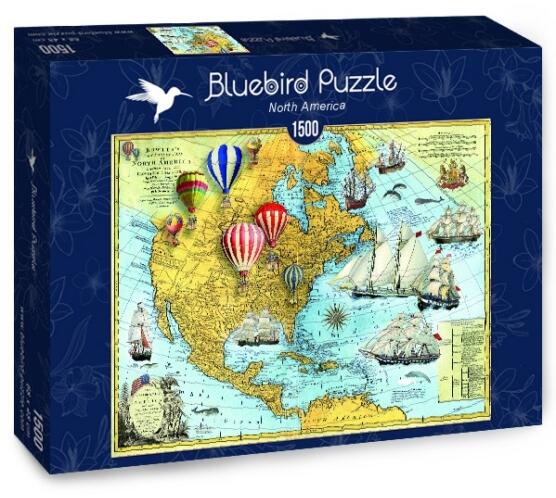 A francia Bluebird 2019 óta van jelen a kirakók világpiacán. Magas minőségű, környezettudatos technológiával készült, mégis megfizethető áron elérhető puzzle képei közt elsősorban művészi alkotások találhatók. Az 1500 db-os Bluebird - North America puzzle képén a német Barbara Behr formatervező egyik alkotása látható, melyen Észak-Amerika régi térképe látható