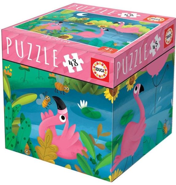 Puzzle Mini Box Flamingo a spanyol Educa vállalattól egy csodaszép képkirakó flamingó motívummal gyerekek részére 4 éves kortól. Összeillesztett kép újra darabjaira szedhető és a dobozban tárolható. Képkirakózás nagyon jó hatással van a fantázia, elképzelőerő és manuális készség fejlesztésére, játék közben fejlődik a kicsik részletekre való odafigyelése és