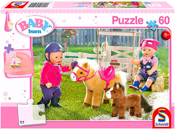 Rakd össze a Baby Born pónifarmon képet a 60 darabos puzzle segítségével! A puzzle kicsik és nagyok számára egyaránt izgalmas és szórakoztató időtöltés, melyet egyszerűen képtelenség megunni. A puzzle játékok nem csak fejlesztik a memóriát, a megfigyelő és koncentrációs képességet, de türelemre és kitartásra is tanítanak. Az ajándék egy Baby Born babára való sa