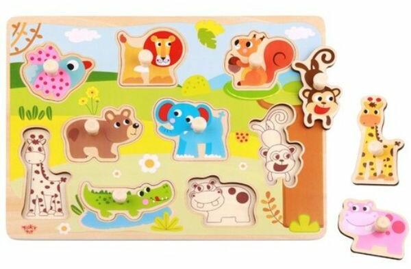 A formakirakó egy vidám, szórakoztató és nem utolsó sorban remek fejlesztő játék a legkisebbek számára. A piciknek nincs más dolguk, mint megragadni az aranyos, fogantyúval ellátott állatokat, majd a helyükre illeszteni. Ebben a szettben 9 darab állat található - madár, oroszlán, mókus, zsiráf, maci, krokodil, elefánt, víziló, majom -, így a gyerekek játék közben vel