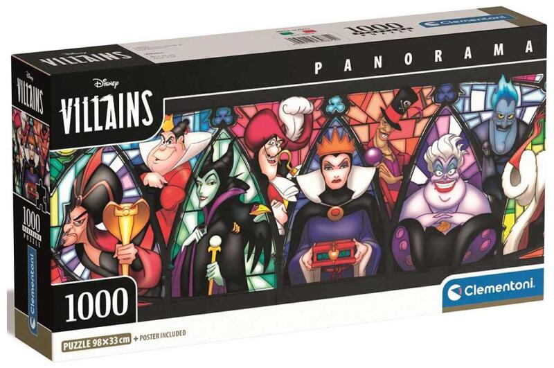 Fedezzétek fel a Disney történetek másik oldalát a „Disney Gonoszok 1000 darabos panoráma puzzle-lel! A Clementoni puzzle-ön a legikonikusabb Disney-gonosztevők, köztük Hókirálynő, Jafar, és Ursula, várják, hogy az őket körülvevő sötét varázslat révén életre keljenek. A lenyűgöző, drámai színek és formák kihívást nyújtanak minden korosztálynak, serkentik a pr