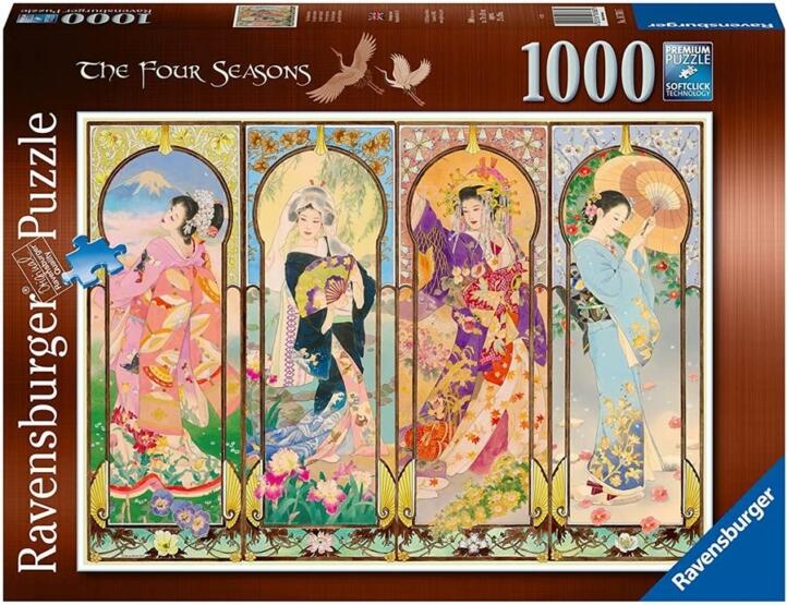 Az 1000 darabos Ravensburger 16768 Puzzle - A négy évszak kirakó segítségével egy lenyűgöző, évszakokat megjelenítő japán műalkotást állíthat össze. A kép négy, tradicionális ruhába öltözött japán hölgyet ábrázol, akik mindegyike az év egy-egy évszakot testesíti meg, finom és elegáns részletek kel. Ahogy kirakja ezt a különleges képet, elmerülhet az ázsiai m