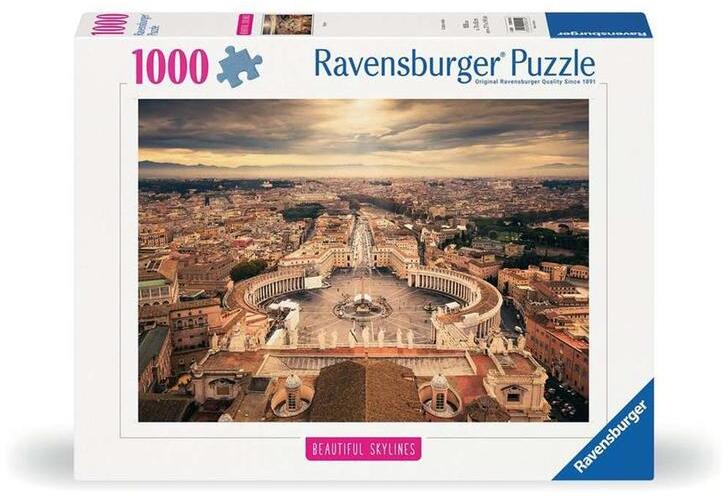 A Ravensburger a világ legnagyobb puzzle gyártója. Széles választékban kapható kirakói a minőséget és a sokszínűséget képviselik. A Ravensburger 1000 db-os - Beautiful Skylines - Róma puzzle képén Róma látképe látható a Szent Péter-bazilika felől.