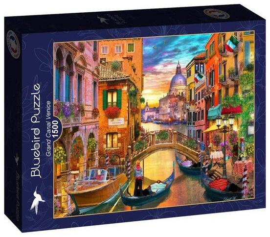 A francia Bluebird 2019 óta van jelen a kirakók világpiacán. Magas minőségű, környezettudatos technológiával készült, mégis megfizethető áron elérhető puzzle képei közt elsősorban művészi alkotások találhatók. Az 1500 db-os Bluebird puzzle - Grand Canal Venice című képén a Canal Grande, Velence főcsatornája látható szépséges gondolákkal és hamisítatlan velence