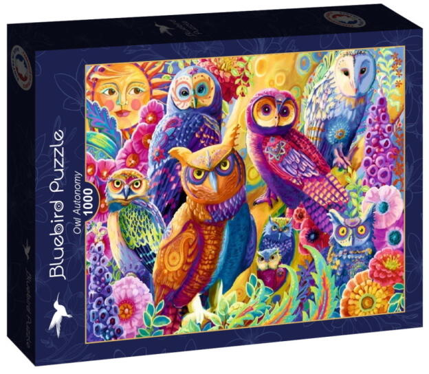 A francia Bluebird vállalat 2019-ben lépett piacra kiváló minőségű kirakóival, megfizethető áron. Fontos szempont számukra a környezettudatosság is, ezért kirakóik dobozait úgy tervezték, hogy minimális mennyiségű kartont használjanak fel a gyártás során. A Bluebird 1000 db-os puzzle - Owl Autonomyl című képen, nagyon szép színes baglyok láthatóak.