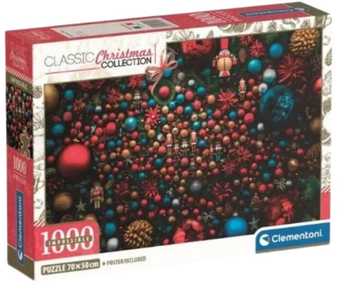 Merüljön el a karácsony varázslatos világában a Clementoni 39926 Impossible Compact puzzle - Karácsonyi díszek (1000 db) segítségével! Ez a lenyűgöző, 1000 darabos puzzle tökéletes választás mindazok számára, akik szeretik a kihívásokat és a minőségi kirakósokat. A puzzle karácsonyi díszeket ábrázol, amelyek tökéletesen megragadják az ünnepi hangulatot. A részlet