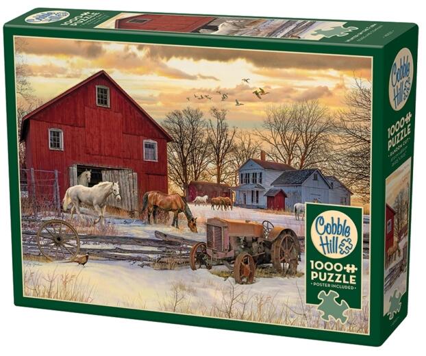 A kanadai Cobble Hill a nosztalgikus, színes, és mindemellett kiváló minőségű kirakókkal kívánja örvendetessé tenni a játék élményt kicsiknek és nagyoknak egyaránt. A Cobble Hill 1000 db-os puzzle - Winter on the Farm című képen egy havas tájat láthatunk, ahol a lovak egy farmon keresgélnek élelem után.