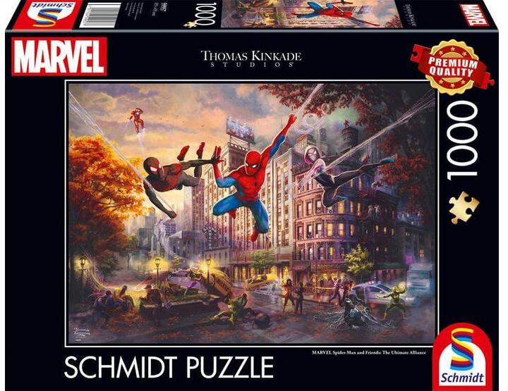 A Schmidt puzzle kiváló minőségű, német gyártmányú kirakó. A speciális matt lakk felhasználás következtében a kirakók fényvisszaverődés nélkül tárják elénk a szebbnél szebb képeket. A Schmidt 1000 db-os puzzle - Spider-Man and Friends című képén a bátor Pókember látható barátai és ellenségei társaságában, Thomas Kinkade stílusában ábrázolva.