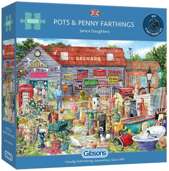 1000 darabos kirakó . Márka: Gibsons Művész: Janice Daughters Kirakott kép méret: 68 x 49 cm Doboz méret: 24 x 24 x 6 cm Eredeti cím: Pots & Penny Farthings GTIN: 5012269063189