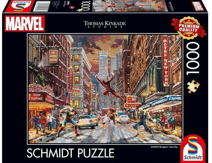 A Schmidt puzzle kiváló minőségű, német gyártmányú kirakó. A speciális matt lakk felhasználás következtében a kirakók fényvisszaverődés nélkül tárják elénk a szebbnél szebb képeket. A Schmidt 1000 db-os puzzle - Marvel - Deadpool kirakón a Deadpool szereplőit láthatjuk New Yorkban, Thomas Kinkade stílusában megörökítve.