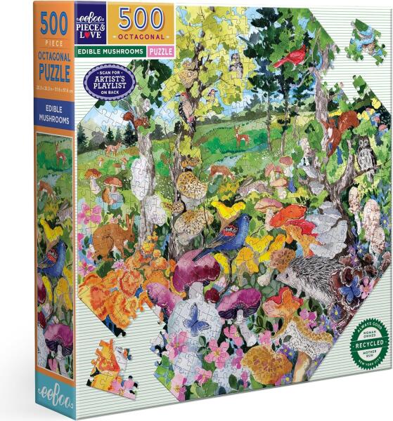 500 darabos kirakó Különleges, nyolcszög alakú kirakó!Új, kisebb dobozban! Külső védőfólia nélküli kiadás. Márka: Eeboo Művész: Hazel Jarvis Kirakott kép méret: 51,6 x 51,6 cm Doboz méret: 25,5 x 25,5 x 5 cm Eredeti cím: Edible Mushrooms GTIN: 689196516306