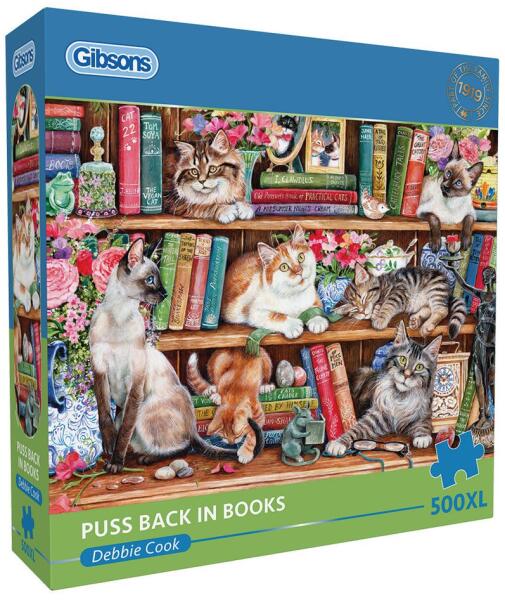 500 darabos kirakó Extra nagy darabos Márka: Gibsons Művész: Debbie Cook Kirakott kép méret: 68 x 49 cm Doboz méret: 24 x 24 x 6 cm Eredeti cím: Puss Back in Books GTIN: 5012269035605