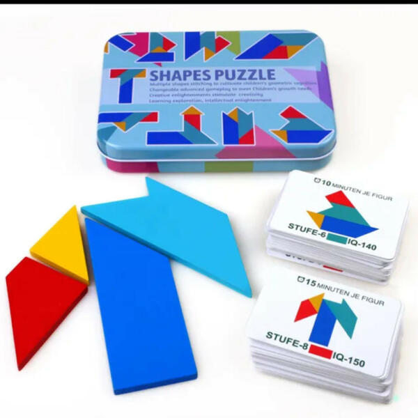 Shapes puzzle - T tipusú Tangram kirakó Kiszerelés: 104 db-os Tartalma: 4 db fa formaelem, 99 db 2 oldalas feladatlap, 1 db fém tároló doboz Fém doboz mérete: 17 x 12 x 2,8 cm Ajánlott életkor: 3+ Shapes puzzle - T tipusú Tangram kirakó A tangram egy ősi kínai logikai feladvány, amely fejleszti a logikát, a térbeli tájékozódást és a megfigyelő képességet. A T puzzle egy n