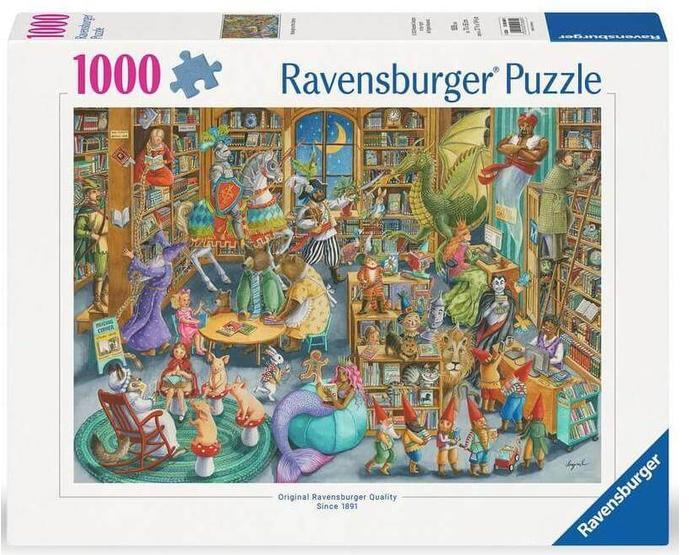 A Ravensburger a világ legnagyobb puzzle gyártója. Széles választékban kapható kirakói a minőséget és a sokszínűséget képviselik. A Ravensburger 1000 db-os - Éjszaka a könyvtárban puzzle képén klasszikus mesék szereplői kelnek életre, Piroska, a három kismalac, Aranyhaj, Robin Hood, az Óz, a nagy varázsló karakterei és még sokan mások.