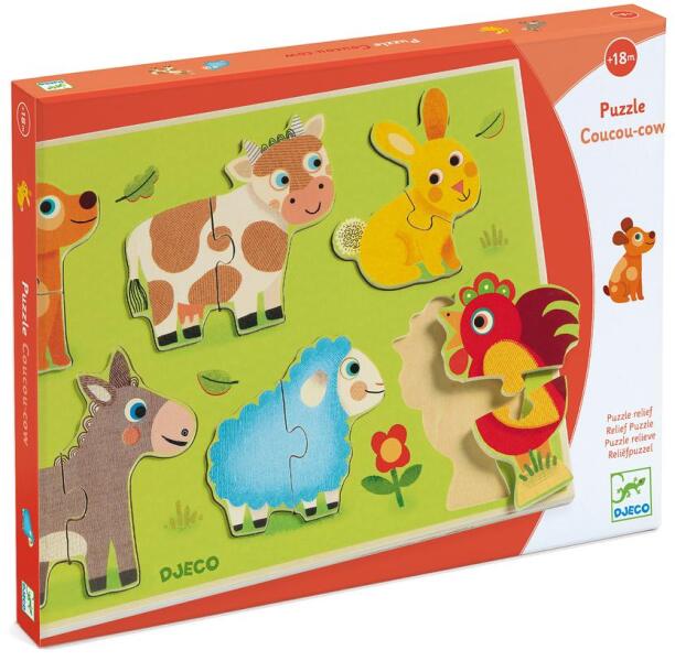 Formaillesztős puzzle - Helló tehén - Coucou cow Az első igazi puzzlefarm témában. Nagyon szépen festett 6x2 darabos, fából készült kirakó. A darabok könnyen beilleszthetőek a helyükre, igazi sikerélményt nyújtva a kicsiknek. A gyerekek 6 állatot párosíthatnak össze: kutya, tehén, nyuszi, szamár, bárány és kakas. Minden állat 2 színes, egyszerűen formázott darabból