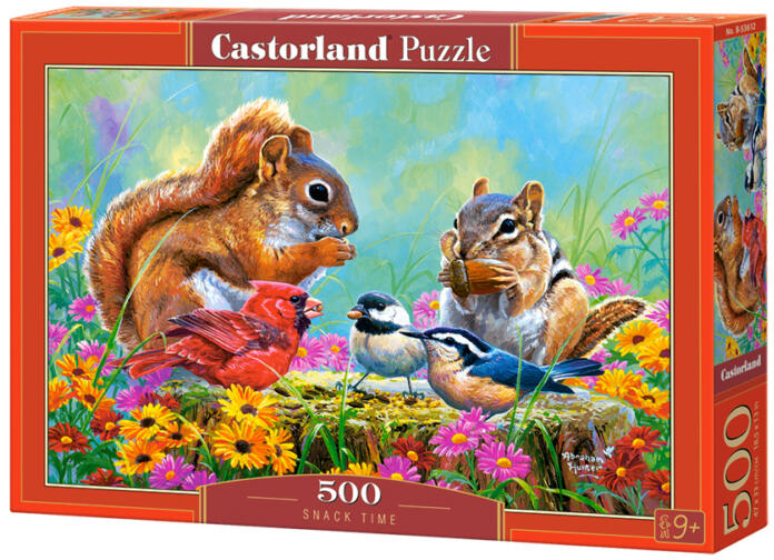 A Castorland kirakók sokszínűségükről ismertek és igen széles választékban kaphatóak. Hagyományos képi témáik mellett különlegesebb, városokat és nevezetességeket ábrázoló kirakókat is találunk kínálatukban. A Castorland 500 db-os puzzle - Nasi idő című képen aranyos madárkák és mókusok eszegetnek.