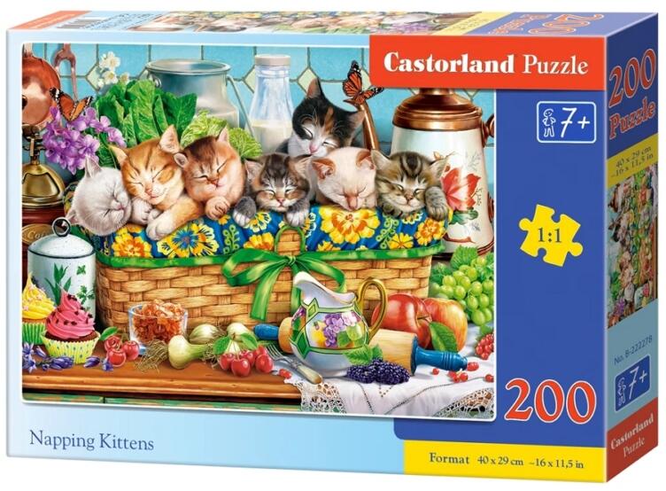 A Castorland kirakók sokszínűségükről ismertek és igen széles választékban kaphatóak. Hagyományos képi témáik mellett különlegesebb, városokat és nevezetességeket ábrázoló kirakókat is találunk kínálatukban. A Castorland 200 db-os puzzle - Szundító Kiscicák kirakón bájos kiscicákat láthatunk.