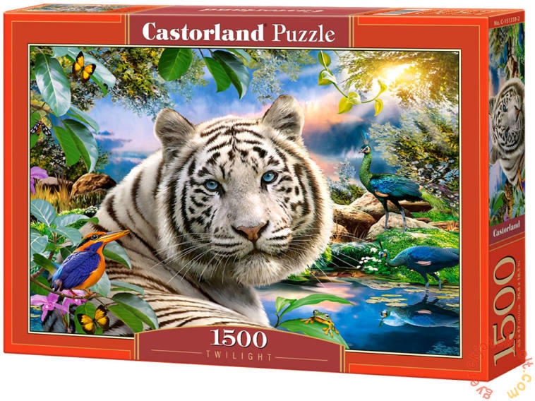 Az alkonyat fantázianévre hallgató 1500 darabos puzzle részletgazdag, színpompás kivitelezéssel készült. A kép főszereplője a gyönyörű fehér tigris, aki legszívesebben alkonyatkor jön elő rejtekhelyéről, hogy elindulhasson vadászni. Az élénk zöld növényzet, a kristálytiszta tó tükre, és az egzotikus állatok illusztrációja varázsolja még különlegesebbé a puzzl