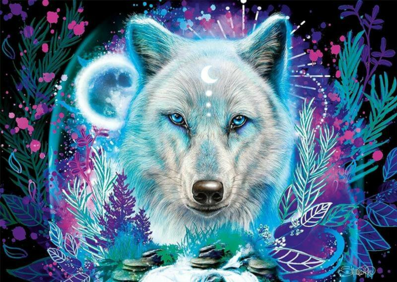 A Schmidt puzzle kiváló minőségű, német gyártmányú kirakó. A speciális matt lakk felhasználás következtében a kirakók fényvisszaverődés nélkül tárják elénk a szebbnél szebb képeket. A Schmidt 1000 db-os puzzle - Neon Arctic Wolf, Sheena Pike című képen, egy farkas látható neon kék és pink fényekkel körbevéve.