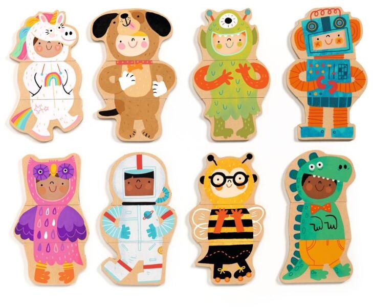 Testséma felismerést segítő vidám játék, képkirakó A Humoros jelmez képkirakó, képillesztő játék, 24 db kirakó elemből áll amelyekből 8 db jelmezes figurát lehet összerakni. Az elemek a figurák logikus alakfelbontása szerint vannak kialakítva. A képkirakó játék elemeit többféle vidám és komoly elgondolás alapján lehetséges összerakni. Ez a játék fejlesztőját