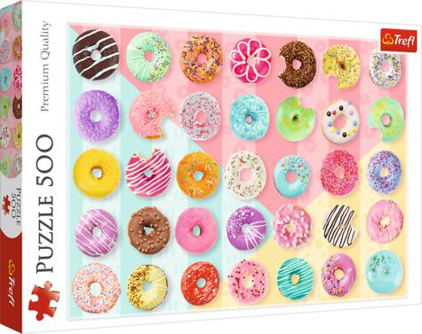 Színes fánkok 500 db-os puzzle - Trefl Hivatalos magyarországi forgalmazótól. Leírás: A színes cukormázzal befont fánkok, biztos, hogy mindenkinek meghozzák a kedvét egy kis édességhez, de persze dekorációként is nagyon jól mutatnak, különösen, ha az ember egy ötszáz darabos puzzle-ből rakja össze, majd keretezi be, hogy aztán az egyik szoba falát díszítse, és egyben