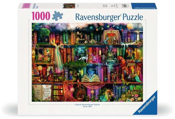 A Ravensburger a világ legnagyobb puzzle gyártója. Széles választékban kapható kirakói a minőséget és a sokszínűséget képviselik. A Ravensburger 1000 db-os - Tündérmesék című puzzle képén Aimee Stewart alkotása látható, egy könyves polc, amit a könyvek szereplői keltenek életre.